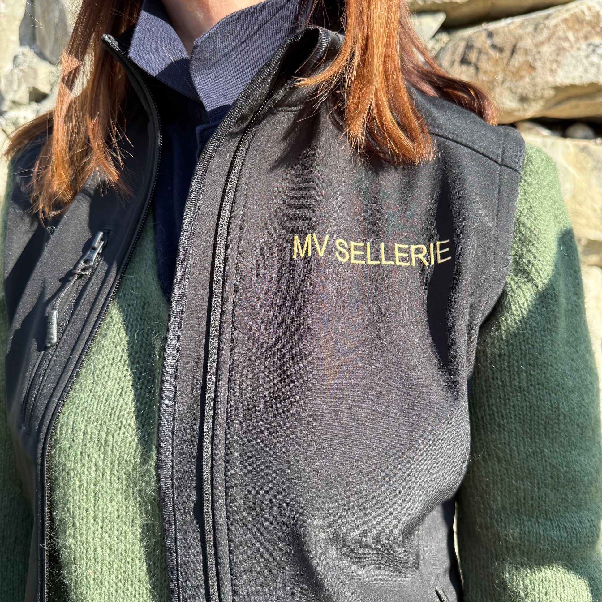 Bodywarmer « Ambassadeur » sans manche en softshell imperméable, coupe-vent et respirant brodée à l’avant sur le cœur « MV SELLERIE » et dans le dos le logo de la sellerie.