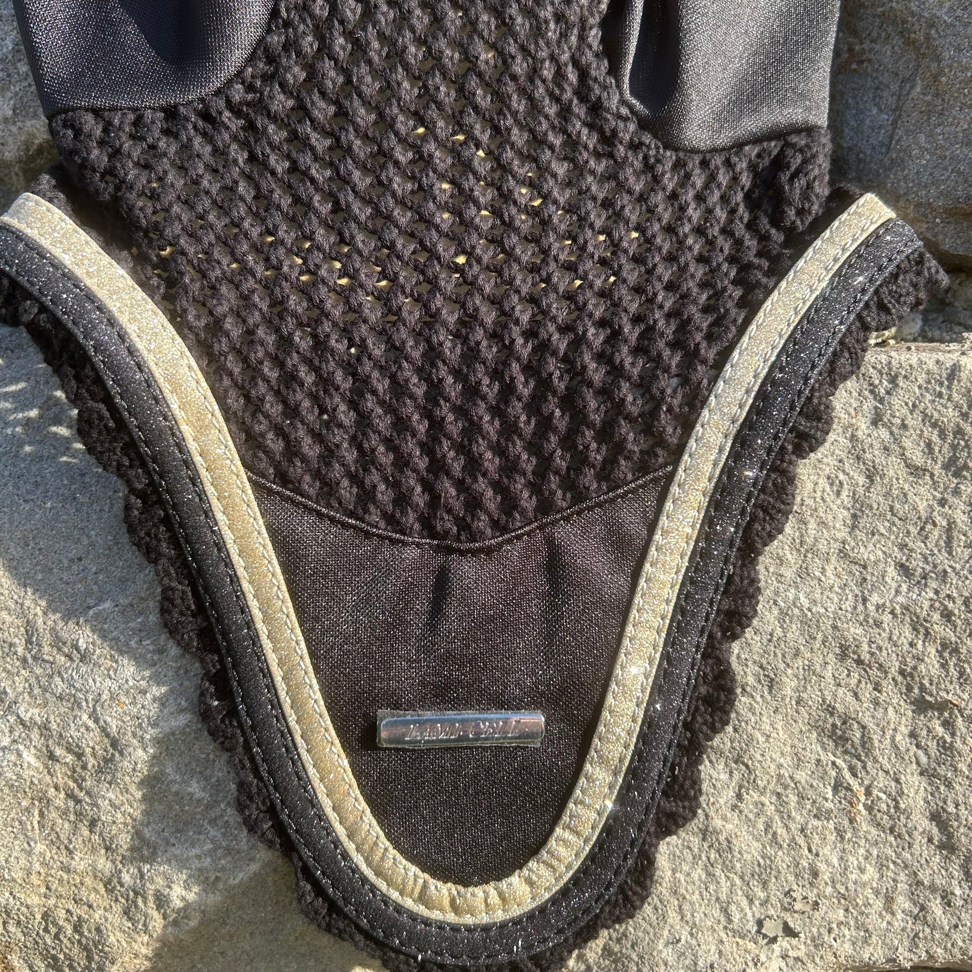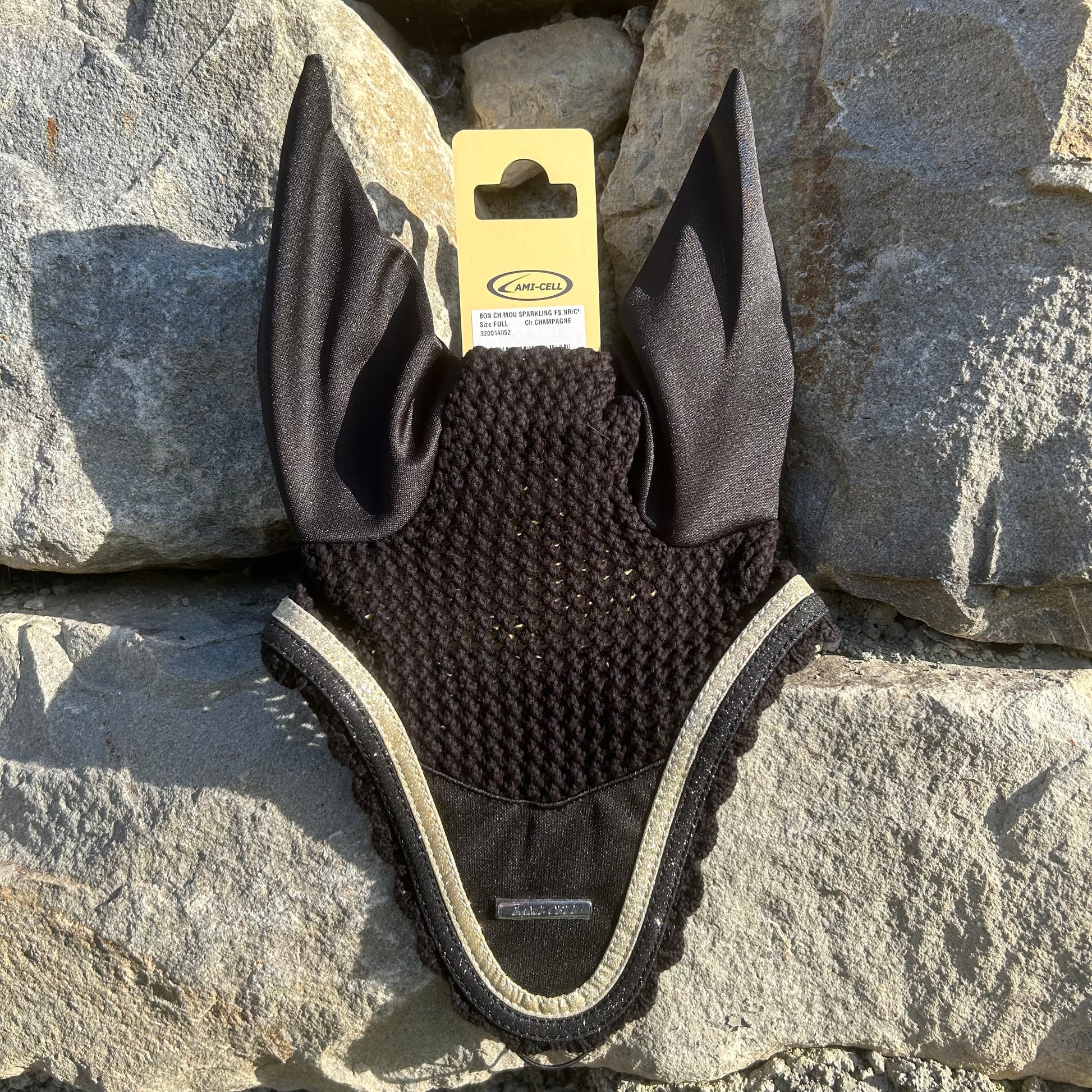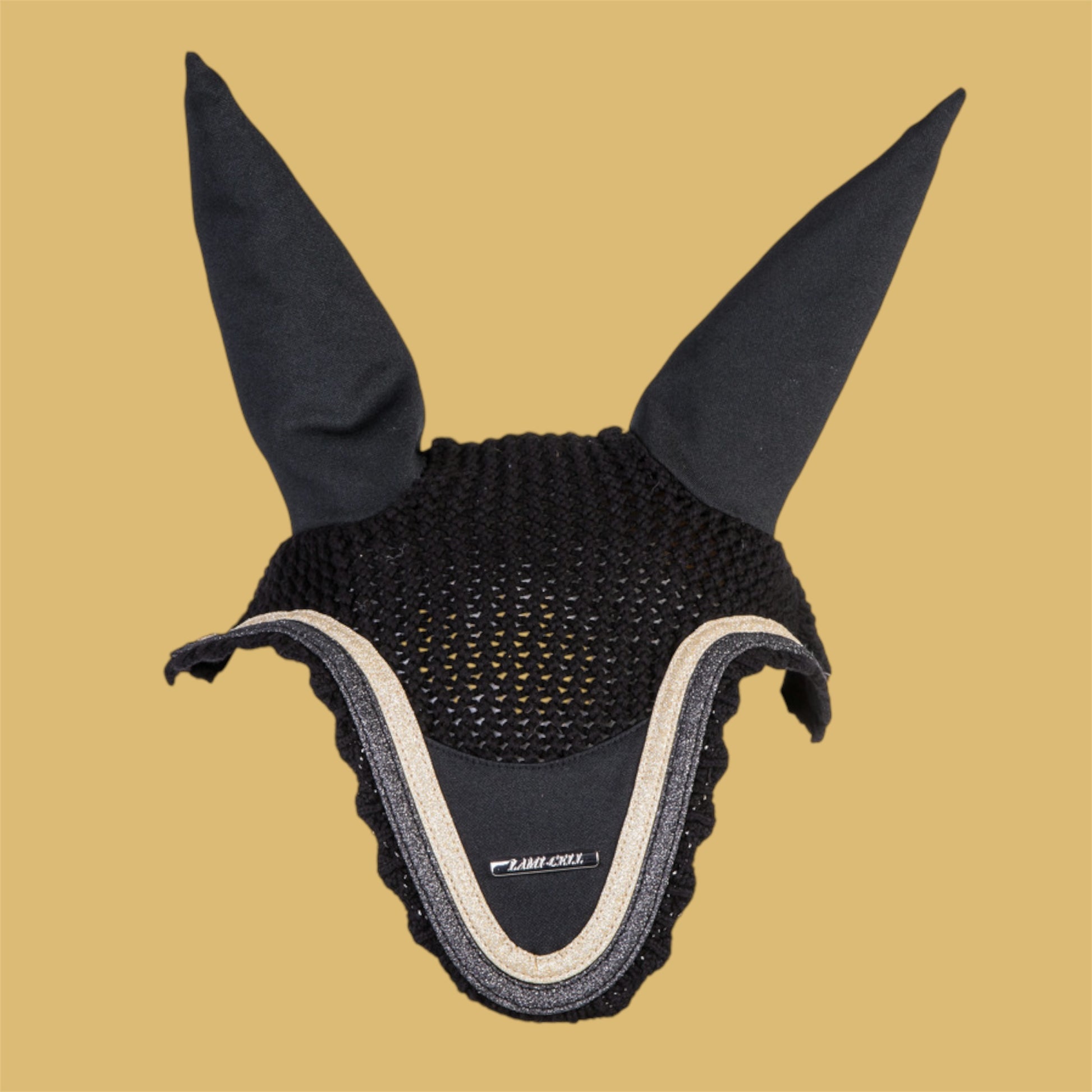 Très chic avec son galon bicolore scintillant, ce bonnet protège votre cheval des insectes et atténue les bruits extérieurs.