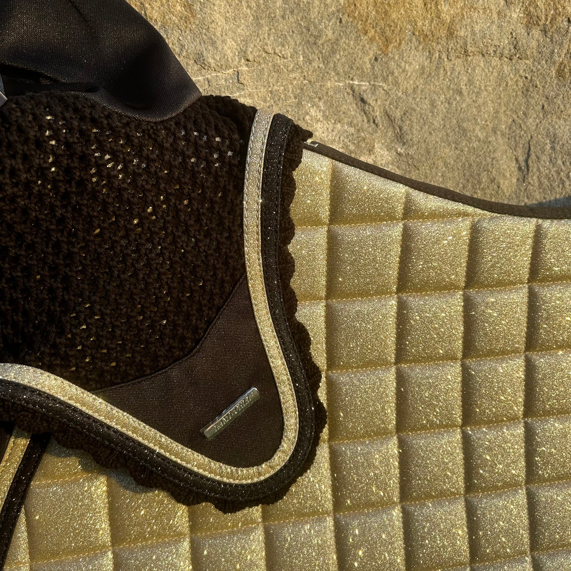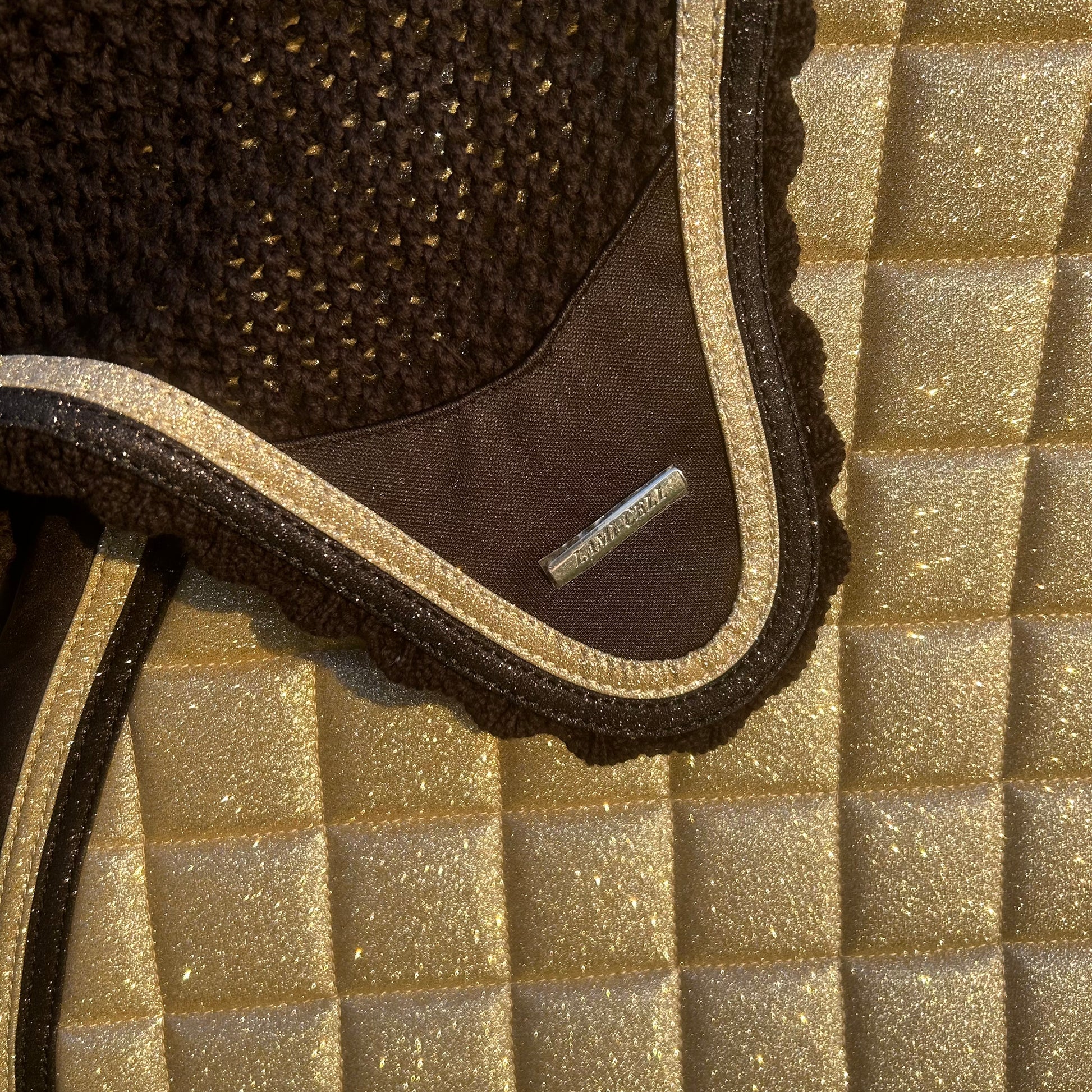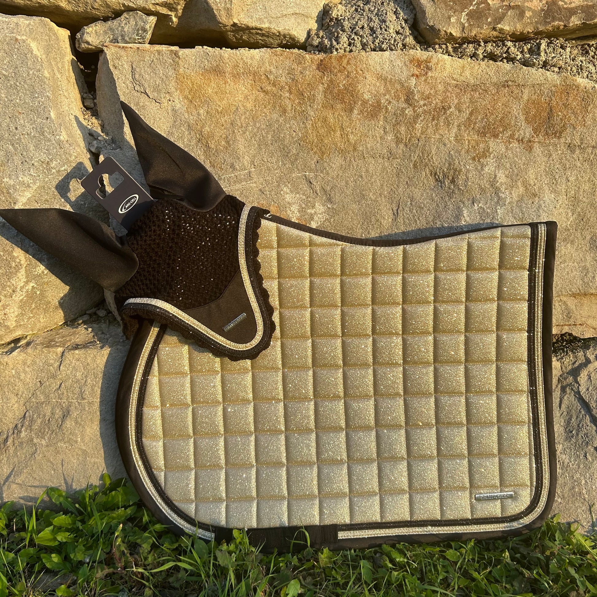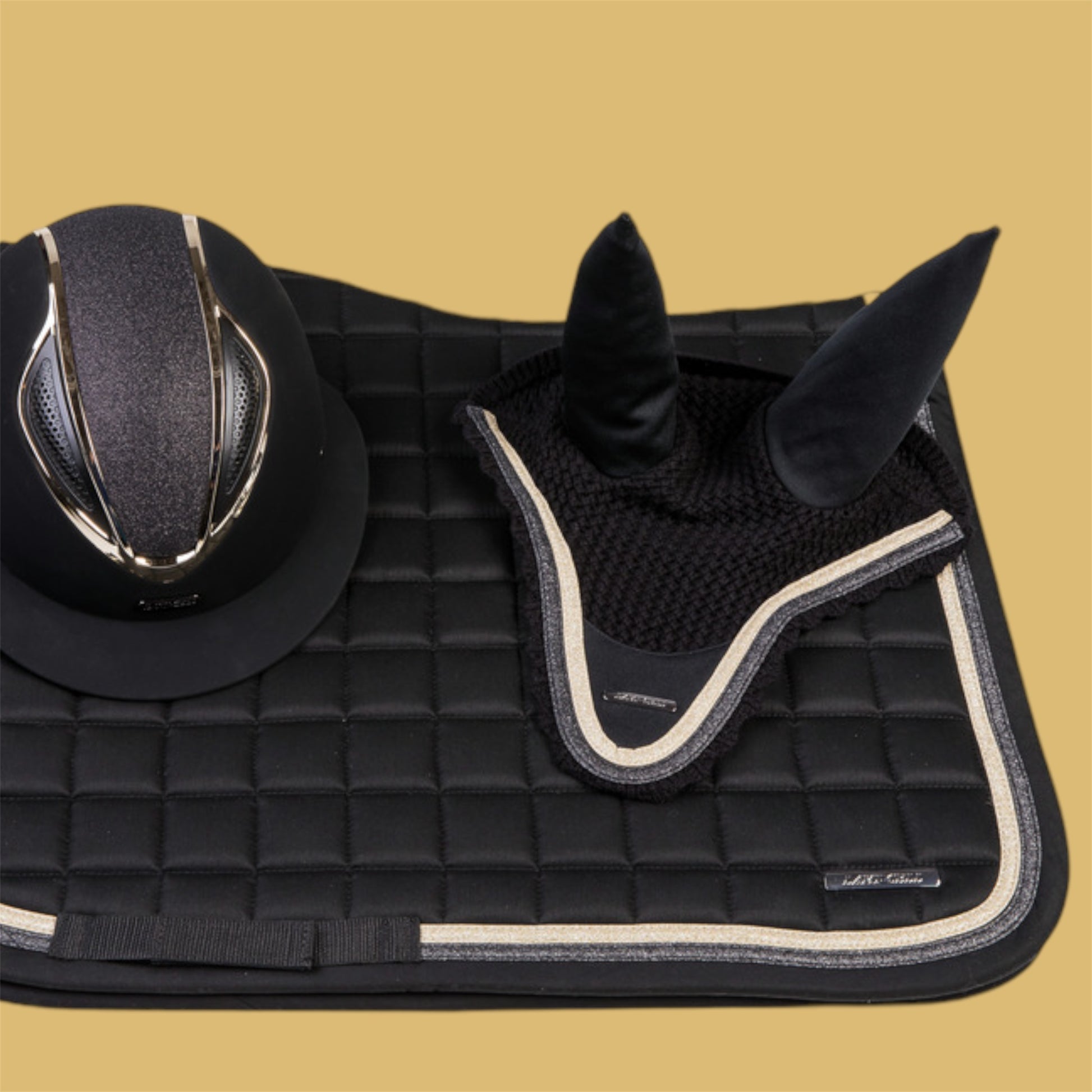 Très chic avec son galon bicolore scintillant, ce bonnet protège votre cheval des insectes et atténue les bruits extérieurs.