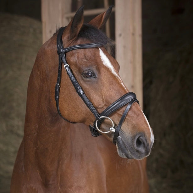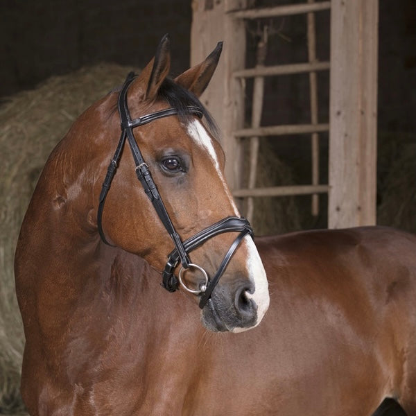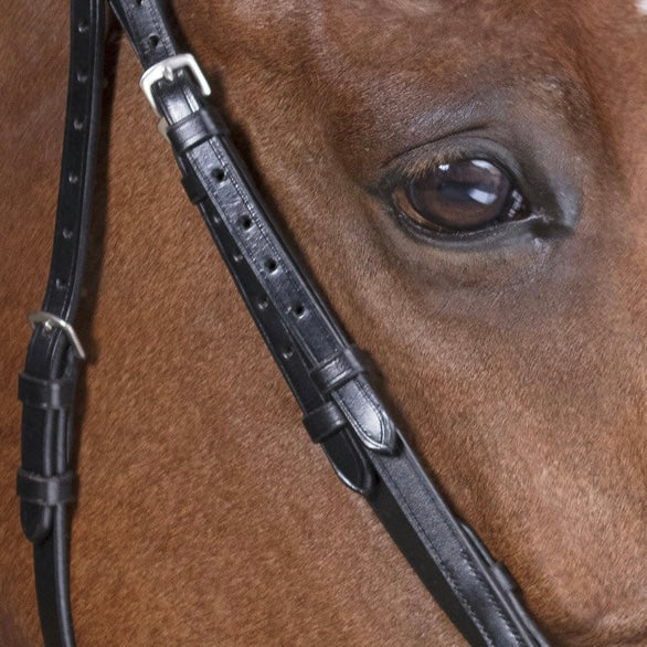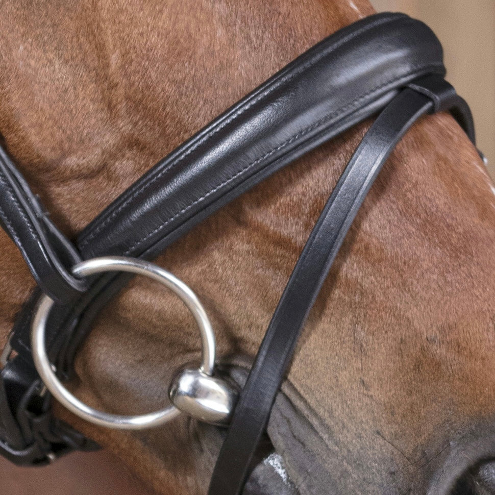Le Bridon Norton Pro Soft est en cuir de buffle avec têtière, frontal et muserolle souple doublés de cuir de vachette. Il possède des coutures noires.