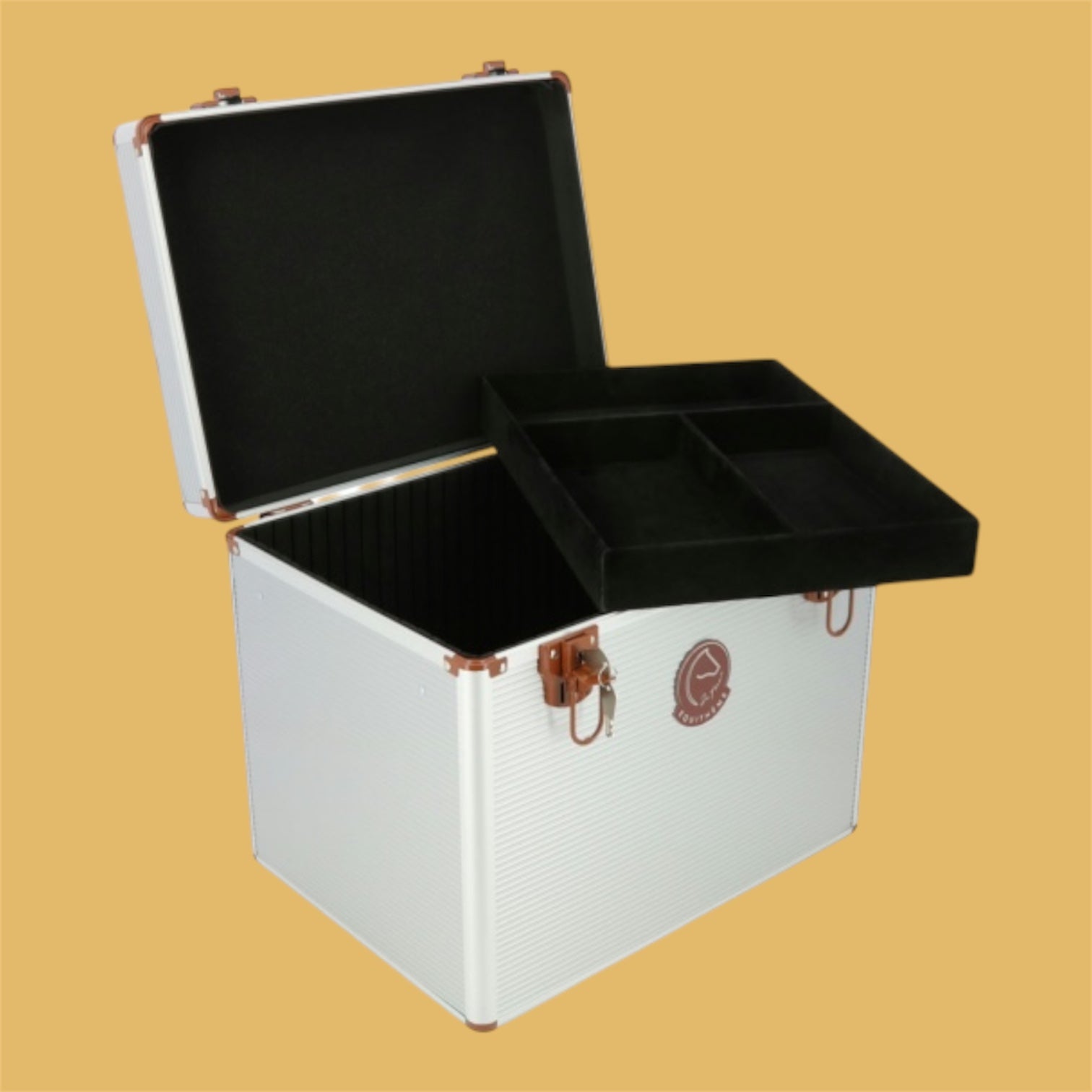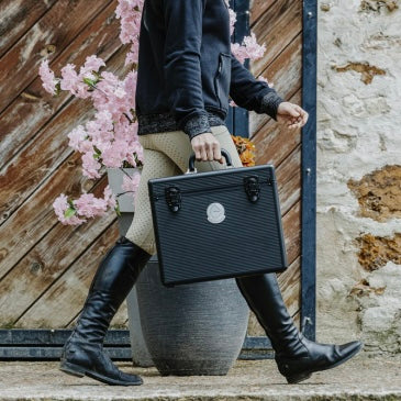 Conçue en aluminium, dotée d'une poignée, de fermetures et de renforts soignés et décorée d'un bel écusson, cette mallette de pansage se distingue par un look très chic.