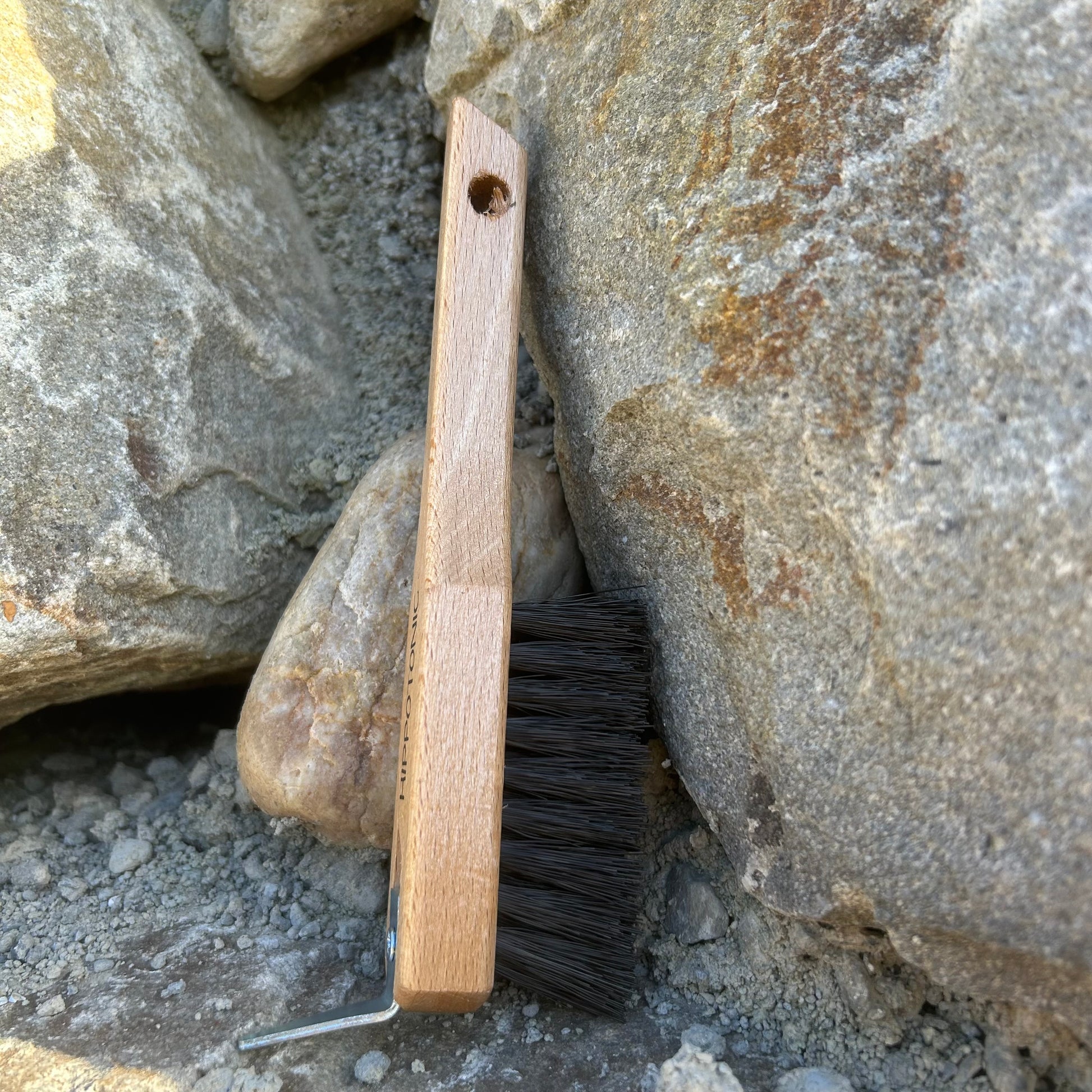 Crochet en métal fixé sur un manche en bois de hêtre vernis, ce cure-pied est associé à une brosse à sabots dotée de poils en polypropylène d'une longueur de 30 mm.