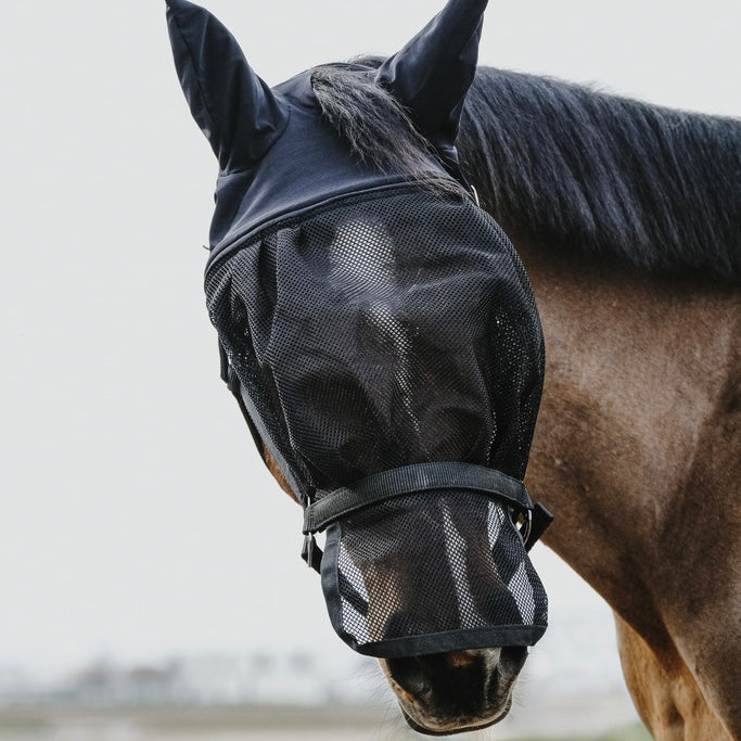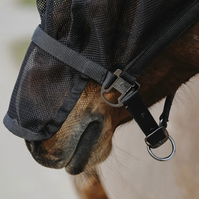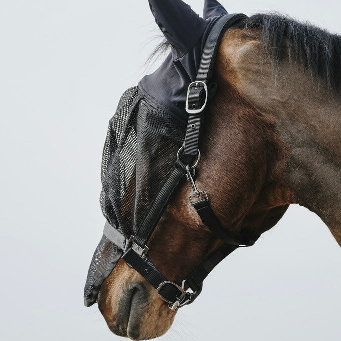 Résistant et confortable, il se compose d'un licol en polypropylène doté d'une doublure en néoprène sur la têtière, la muserolle et les montants pour plus de confort, d’un bonnet anti-insectes en tissu mesh avec oreilles en lycra pour pour protéger des insectes et d'une petite bavette en mesh qui protège les naseaux pour une protection optimale.