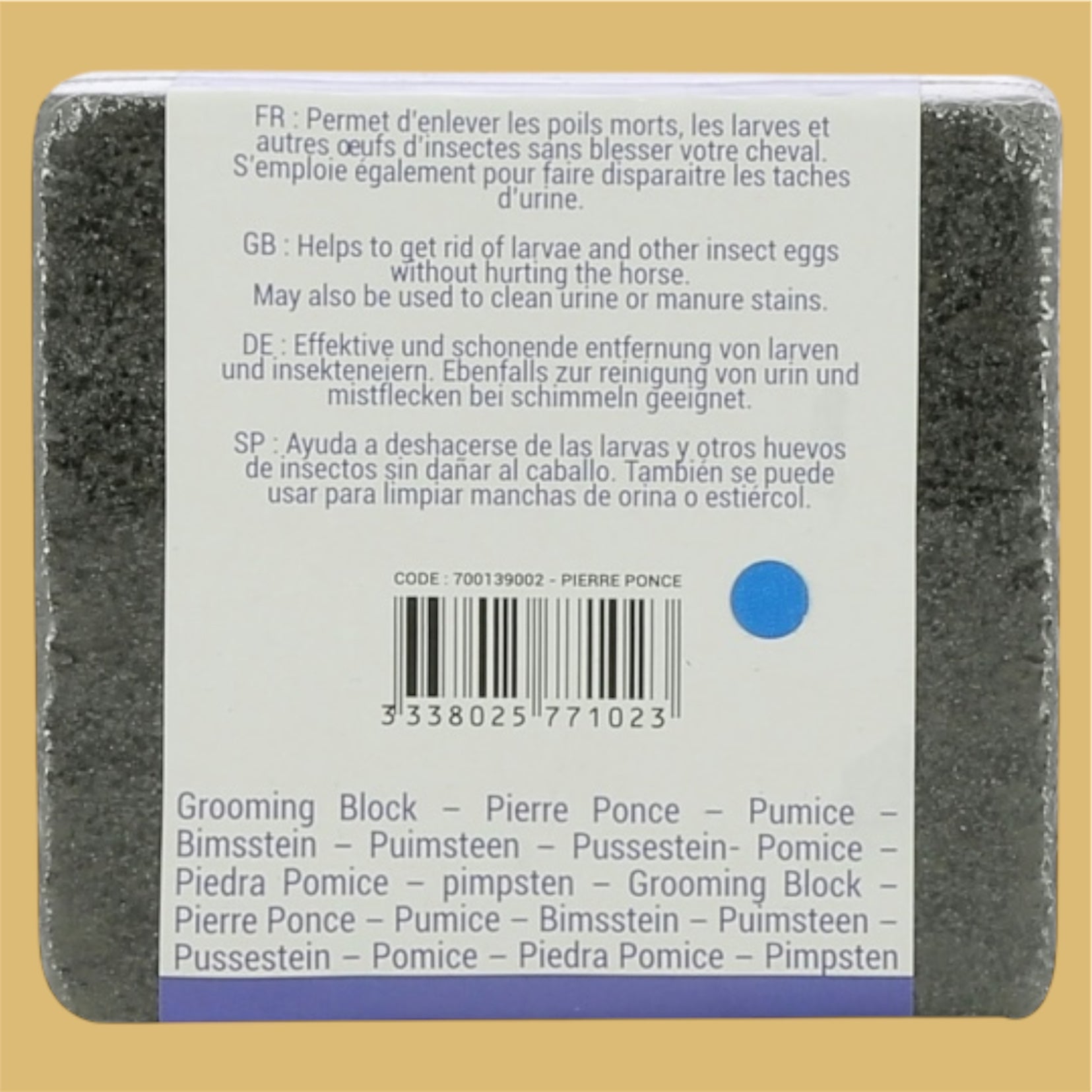 La pierre a poncer s’emploie pour faire disparaître les taches d'urine ou de fumier. Idéale pour les chevaux gris.