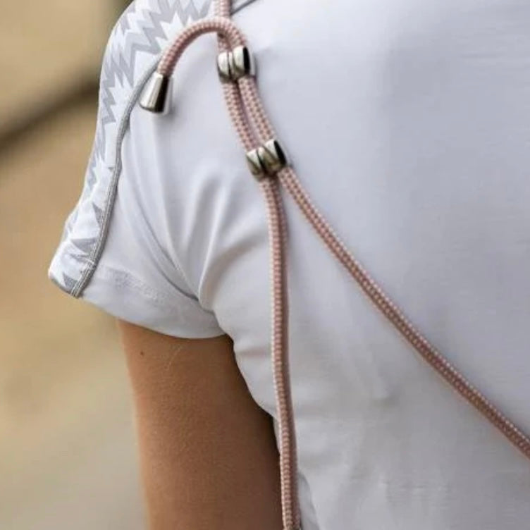 - Un support en Mesh noir esprit enveloppe assez craquant et un cordon réglable rose pâle pour s'adapter à toutes les tailles.